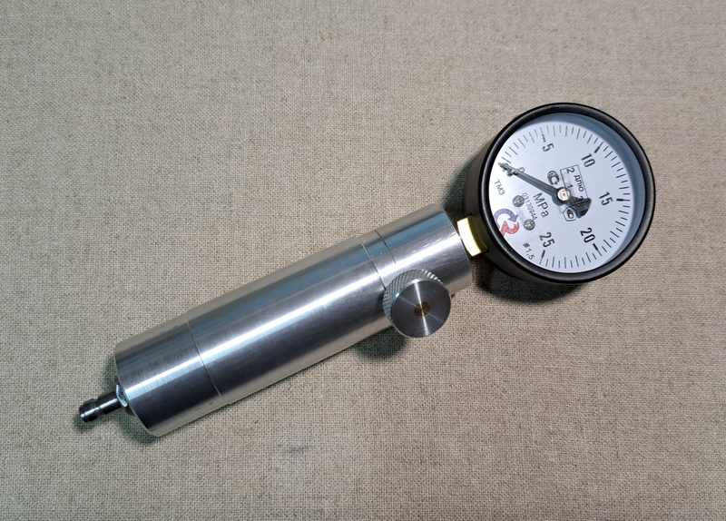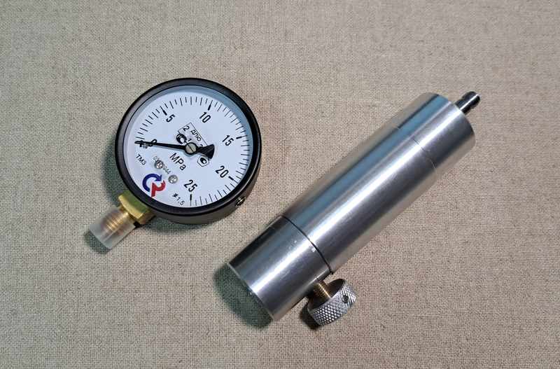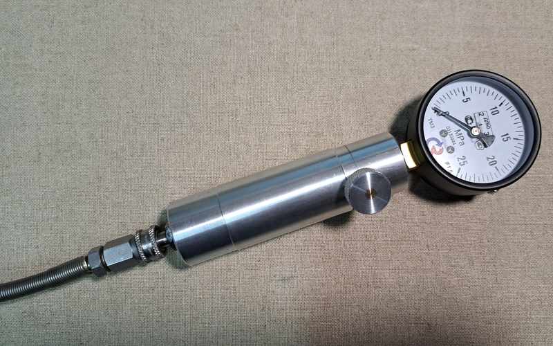 Подаем давление, считываем показания с манометра. При измерении стенд нужно держать вертикально. Для имитации работа клапана кратковременно ослабляем винт сброса давления.